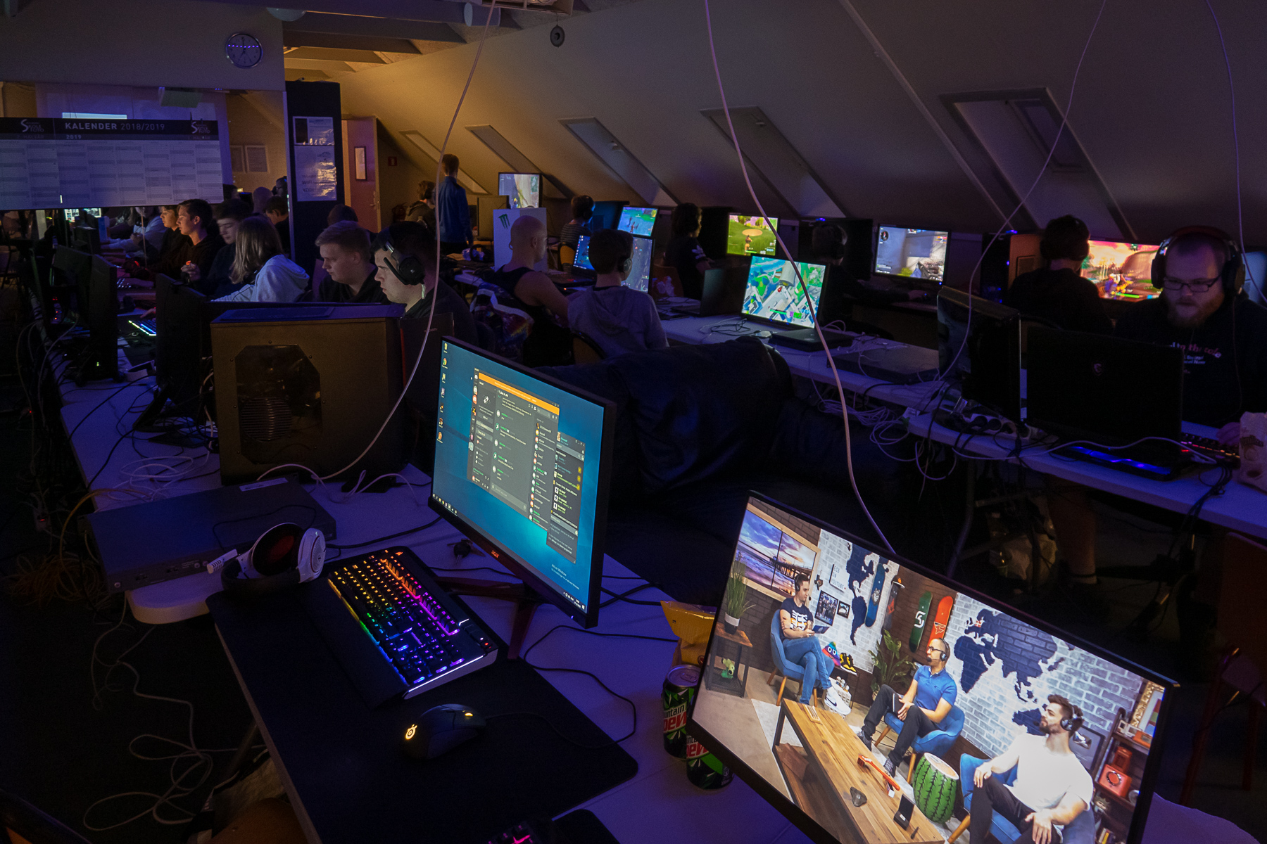 Som I kan se på billederne så er det et ægte lan party med medbragte maskiner, og kabler overalt. Vi tæller ca 25 pc’er og PS4’er.