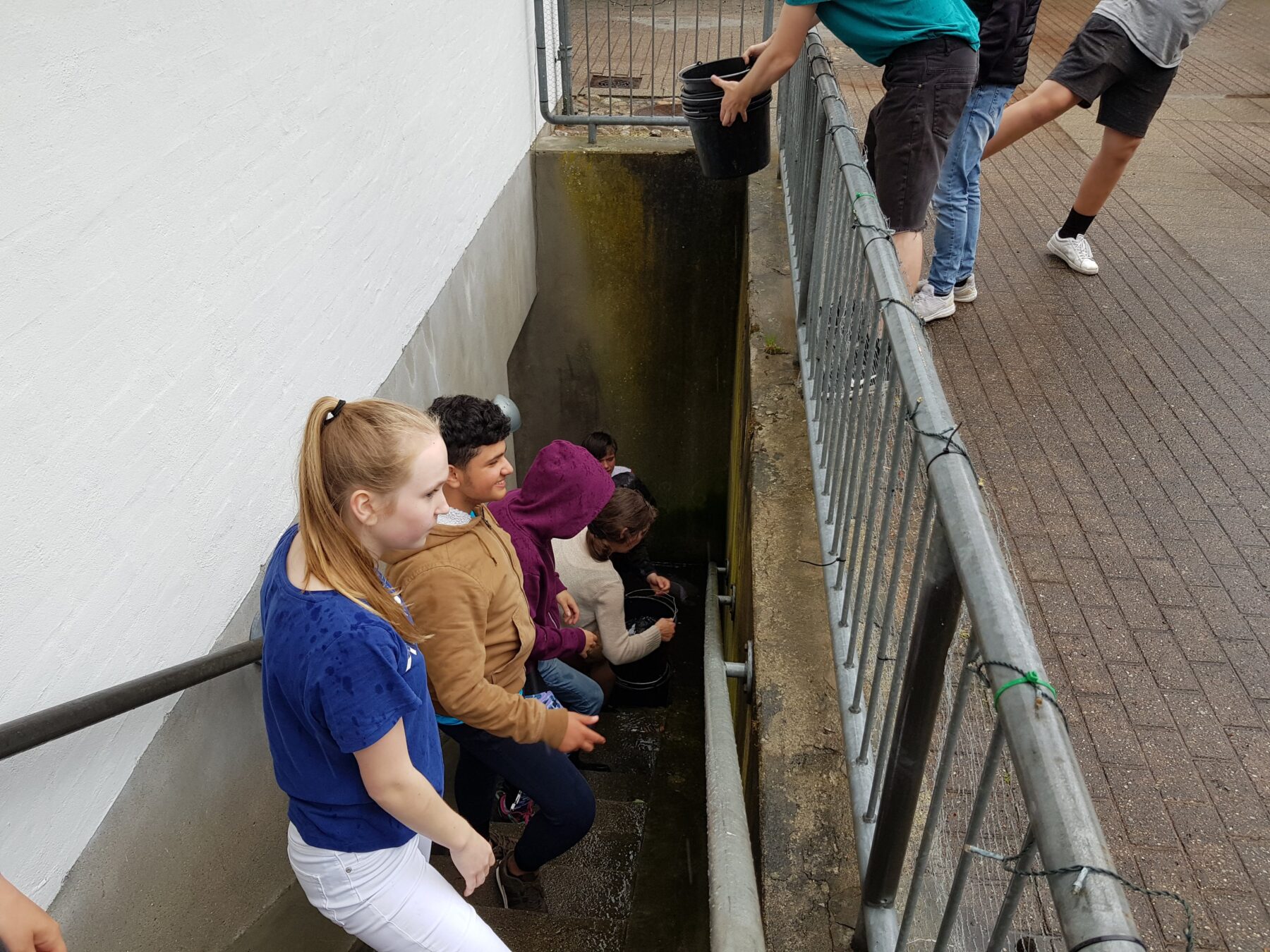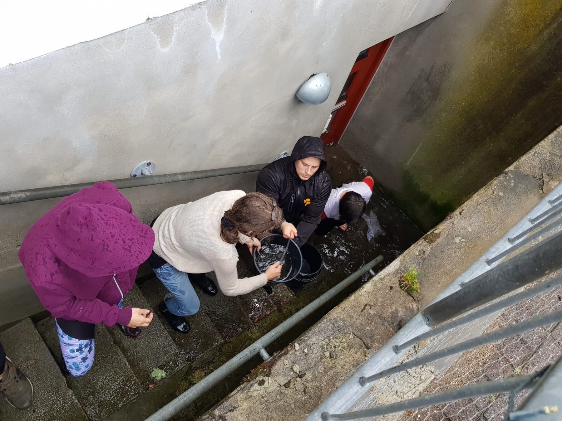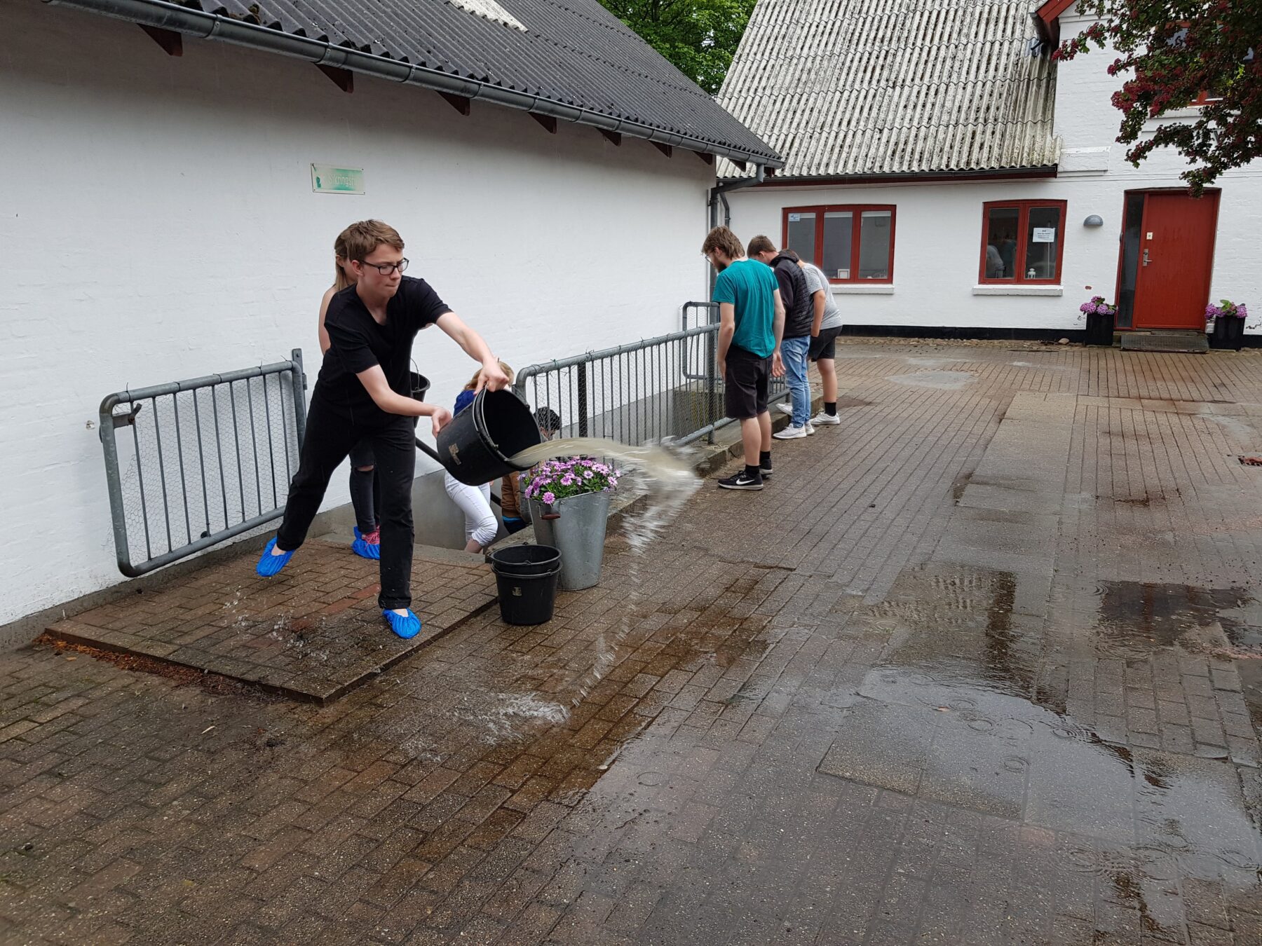 Vi har nogle gode unge som er god til samarbejde. Det har de netop vist med 3 DAGE MED HEST 19, så der blev taget fat med at få taget det værste vand selvom de blev meget våde selv. Nu venter vi på kloak servicen skal komme så vi kan få suget det sidste vand op, og få sat tørring af rummet igang.
