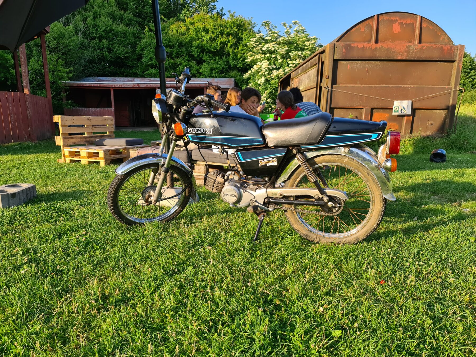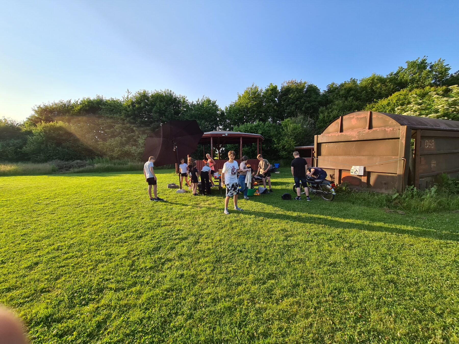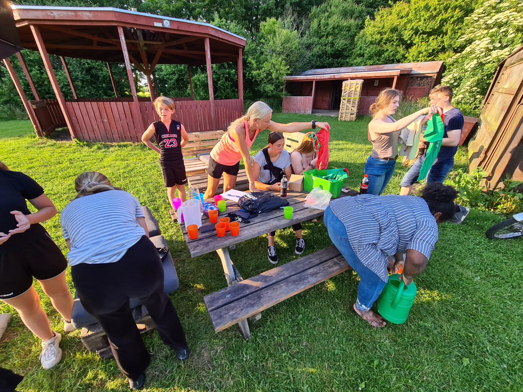 Til aften er der godt gang i vores Ungdomsklub. Der bliver spillet fodbold, rundbold, vandkamp m.v. i den skønne sol med god musik fra vores Soundboks. Nye blomster er ved at blive plantet mens vores heste nyder fyraften efter dagens ridning.